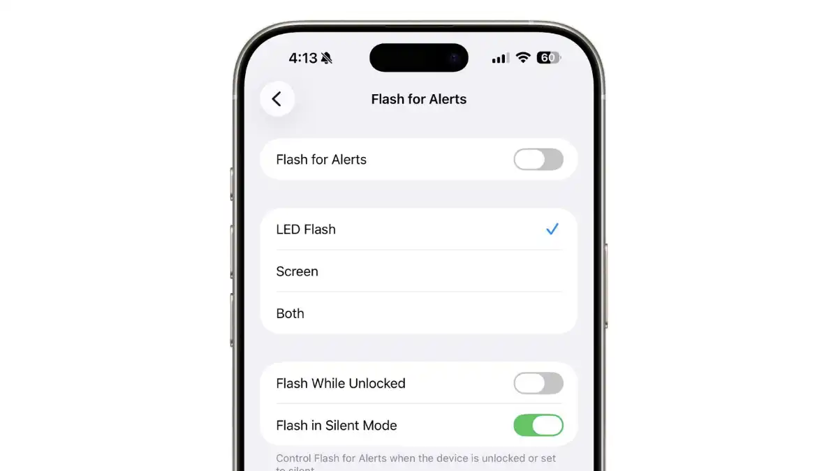 • Flash in modalità Silenzioso: Fondamentale se vuoi che il flash funzioni solo quando hai disattivato la suoneria (levetta laterale su rosso), trasformandolo in un avviso discreto ma visibile.